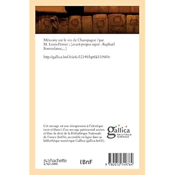 Mémoire sur le vin de Champagne / par M. Louis-Perrier ; [avant-propos signé : Raphaël Bonnedame,...]Date de l'édition originale : 1886Sujet de l'ouvrage : Vin de ChampagneLe présent ouvrage s'inscrit dans une politique de conservation patrimoniale des ouvrages de la littérature Française mise en place avec la BNF.HACHETTE LIVRE et la BNF proposent ainsi un catalogue de titres indisponibles, la BNF ayant numérisé ces œuvres et HACHETTE LIVRE les imprimant à la demande.Certains de ces ouvrages reflètent des courants de pensée caractéristiques de leur époque, mais qui seraient aujourd'hui jugés condamnables.Ils n'en appartiennent pas moins à l'histoire des idées en France et sont susceptibles de présenter un intérêt scientifique ou historique.Le sens de notre démarche éditoriale consiste ainsi à permettre l'accès à ces œuvres sans pour autant que nous en cautionnions en aucune façon le contenu.Pour plus d'informations, rendez-vous sur www.hachettebnf.fr