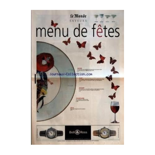 MONDE SAVEURS (LE) [No 18631] du 19/12/2004 - MENU DE FETES - ENTREE - LE FOIE GRAS, UNE QUESTION DE TECHNIQUE ET DE SAVOIR-FAIRE - A SERVIR AVEC UN VIN BLANC DU CAP CORSE - PLAT - LE CHAPON, CASTRAT DE LA BASSE-COUR, PRINCE DE LA FETE - A SERVIR AVEC UN MEURSAULT, BLANC DE BOURGOGNE - DESSERT - UNE BUCHE AU CHOCOLAT, GATEAU ROULE GLACE DE CREME - A SERVIR AVEC UN MAURY, ROUGE DU ROUSSILLON - CHAMPAGNE - LE COMPAGNON FIDELE CONVIE A TOUS LES MOMENTS DE LA TABLE - DECO Details